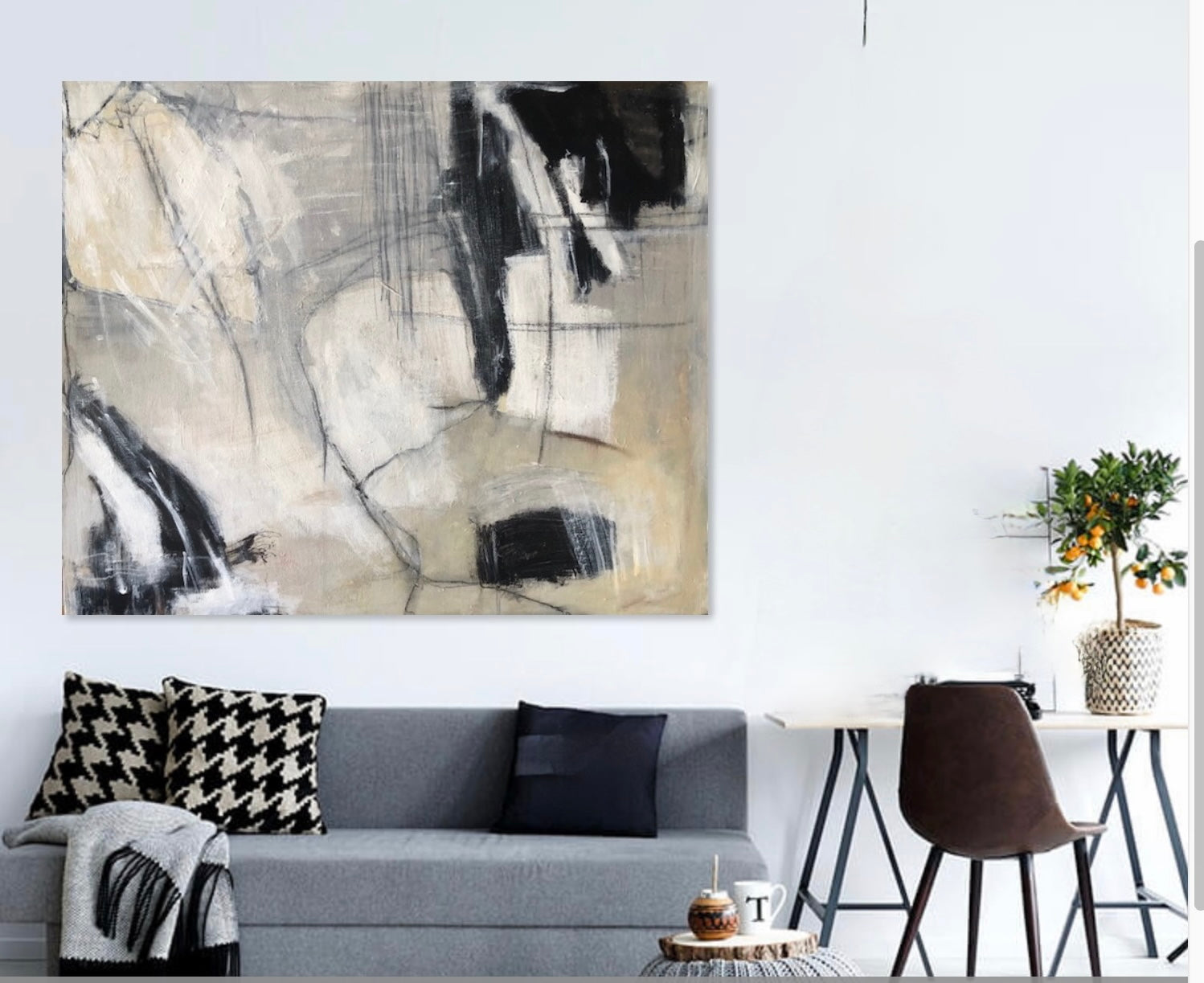 This contemporary painting will complement a sophisticated living room, dining area, home office or commercial space. You will definitely achieve a calm and welcoming atmosphere. Acrylic, charcoal and oil sticks on canvas